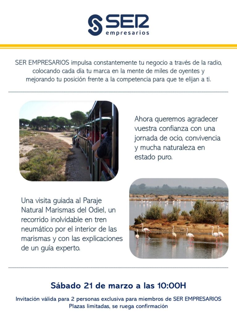 El pasado sábado 21 de marzo SER Empresarios Huelva volvió agradecer la confianza de las empresas onubenses en una jornada de ocio, convivencia y naturaleza en estado puro en el Paraje Natural de las Marismas del Odiel.