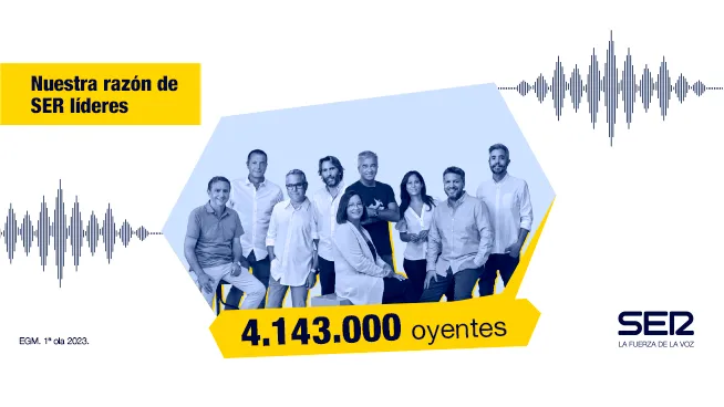 Según la 1ª ola del EGM 2023, la Cadena SER consolida su liderazgo al registrar 4.143.000 oyentes. La SER aumenta así la ventaja con COPE hasta los 586.000 oyentes y 2.146.000 respecto a Onda Cero y se afianza como la opción favorita en información y entretenimiento.